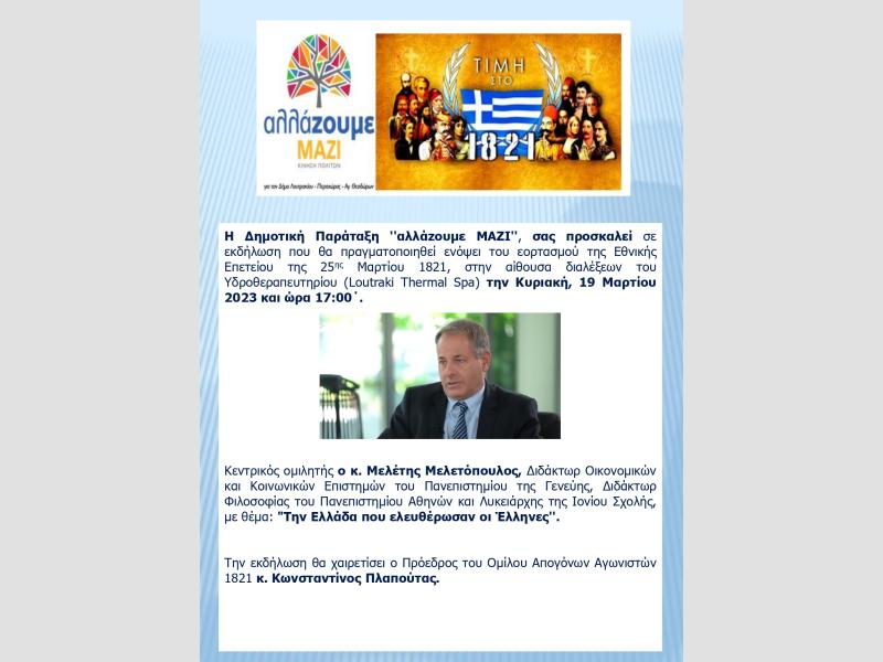 ΕΚΔΗΛΩΣΗ ΤΗΣ ΔΗΜΟΤΙΚΗΣ ΠΑΡΑΤΑΞΗΣ ''ΑΛΛΑΖΟΥΜΕ ΜΑΖΙ'', ΓΙΑ ΤΟΝ ΕΟΡΤΑΣΜΟ ΤΗΣ ΕΘΝΙΚΗΣ ΕΠΕΤΕΙΟΥ ΤΗΣ 25ης ΜΑΡΤΙΟΥ 1821, ΣΤΟ ΥΔΡΟΘΕΡΑΠΕΥΤΗΡΙΟ ΛΟΥΤΡΑΚΙΟΥ, ΤΗΝ ΚΥΡΙΑΚΗ, 19 ΜΑΡΤΙΟΥ 2023 ΚΑΙ ΩΡΑ 17:00